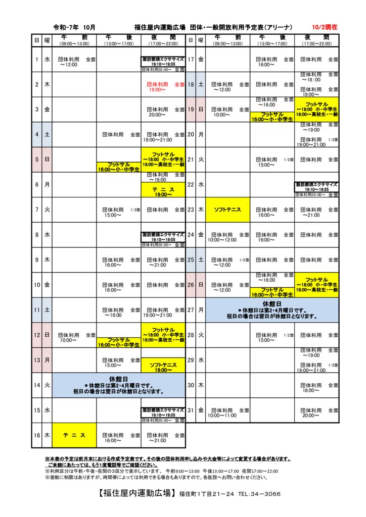 ◇2025年10月 福住カレンダー